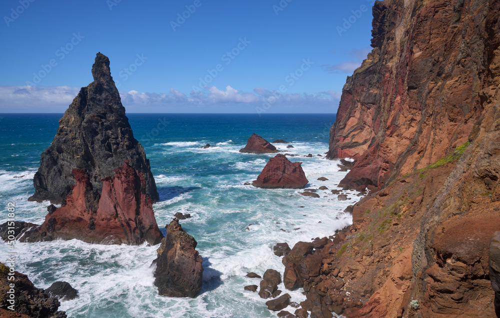 Pyroclastic rocks, basalt dykes, eroded coastline in Ponta de San ...