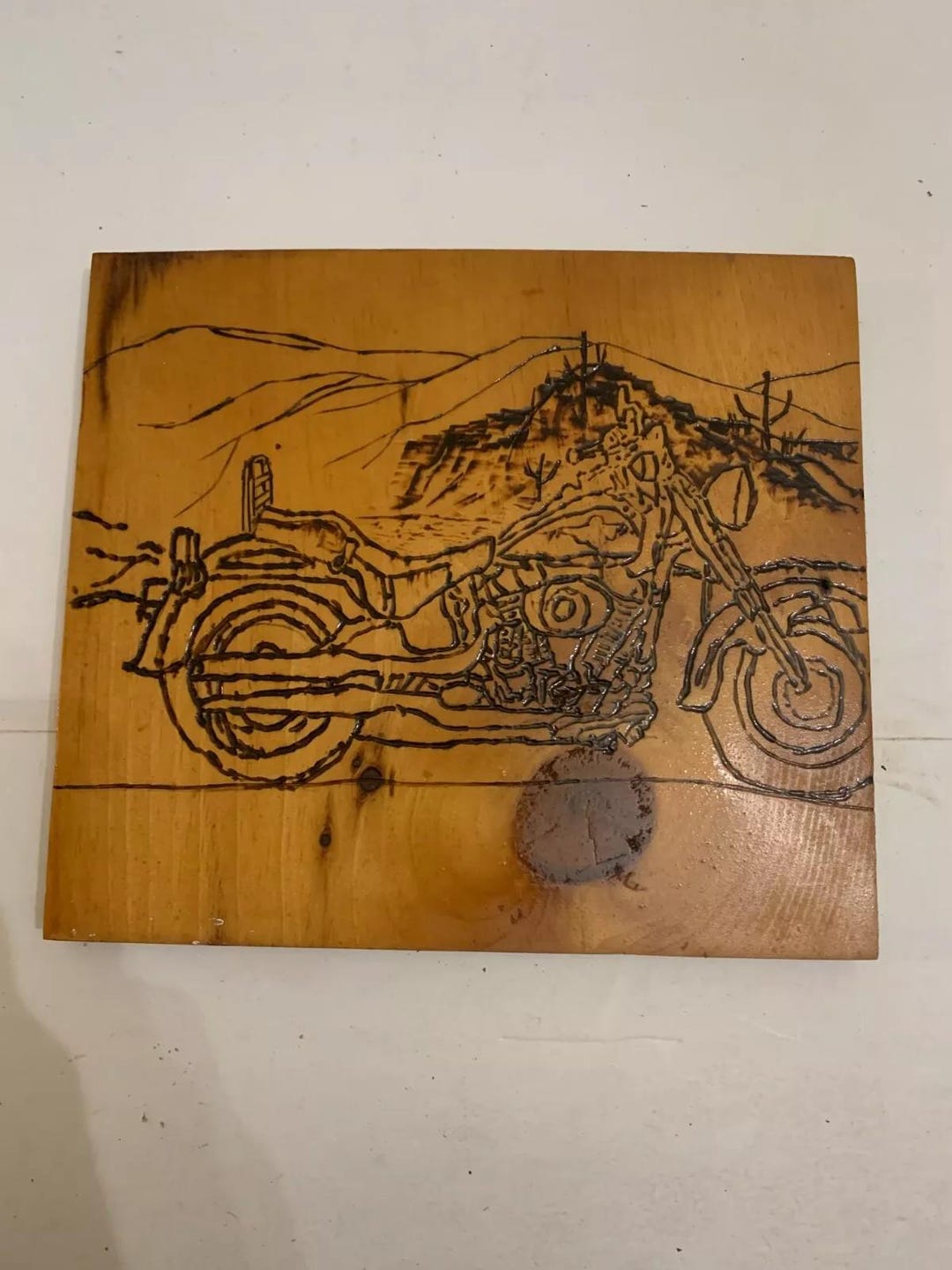 Handmade Pyrography Wood Burned Motorcycle Art