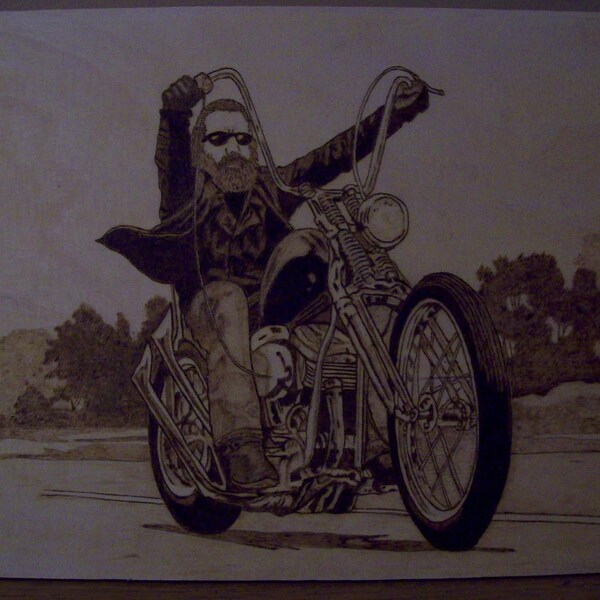 Harley Davidson motorbike woodburning pyrography portrait burnt onto ...