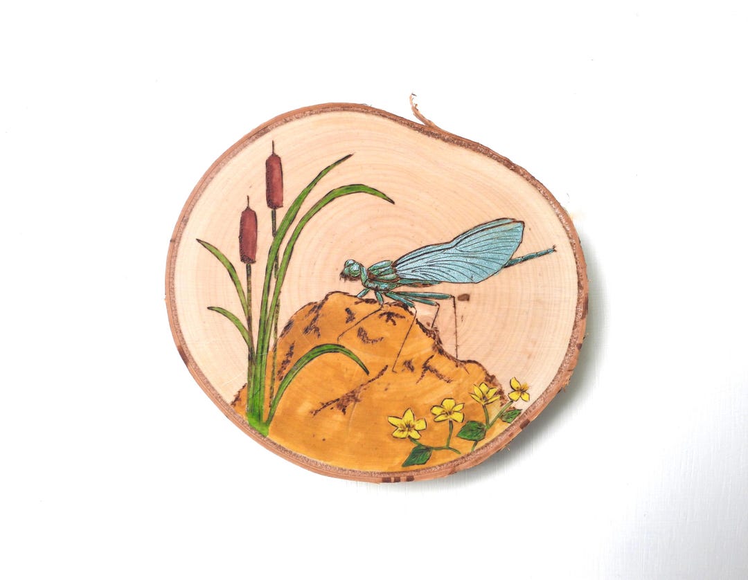Dragonfly on Rock, Pyrography, Dragonfly Plaque, Reeds, Marsh Marigold ...