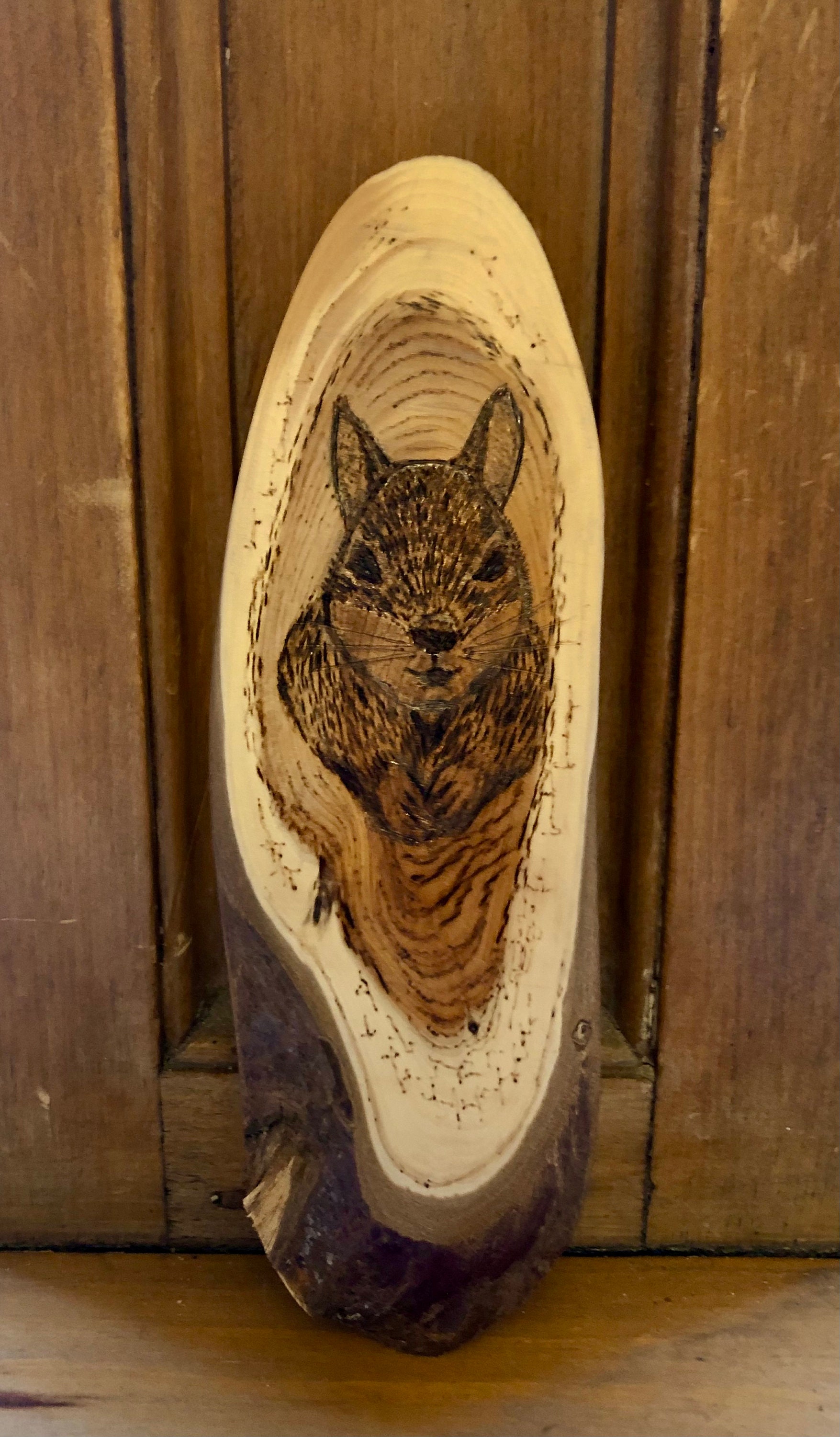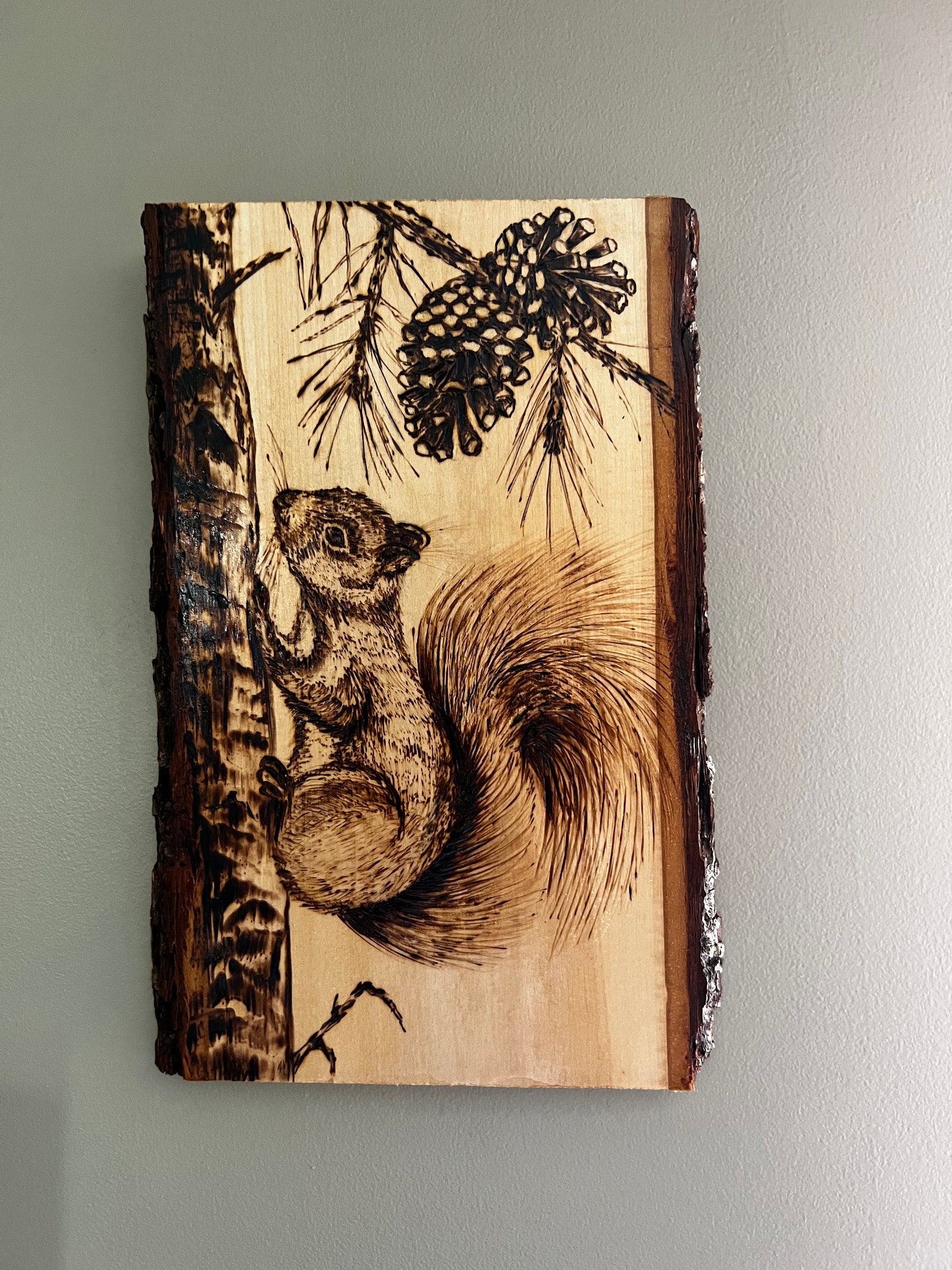 Wood burn, stain, and paint combo of a squirrel on some scrape pine ...