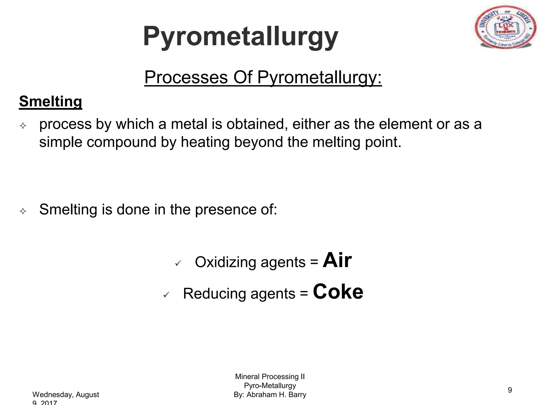 Unit processes in Pyrometallurgy- Drying, Roasting, Calcination ...