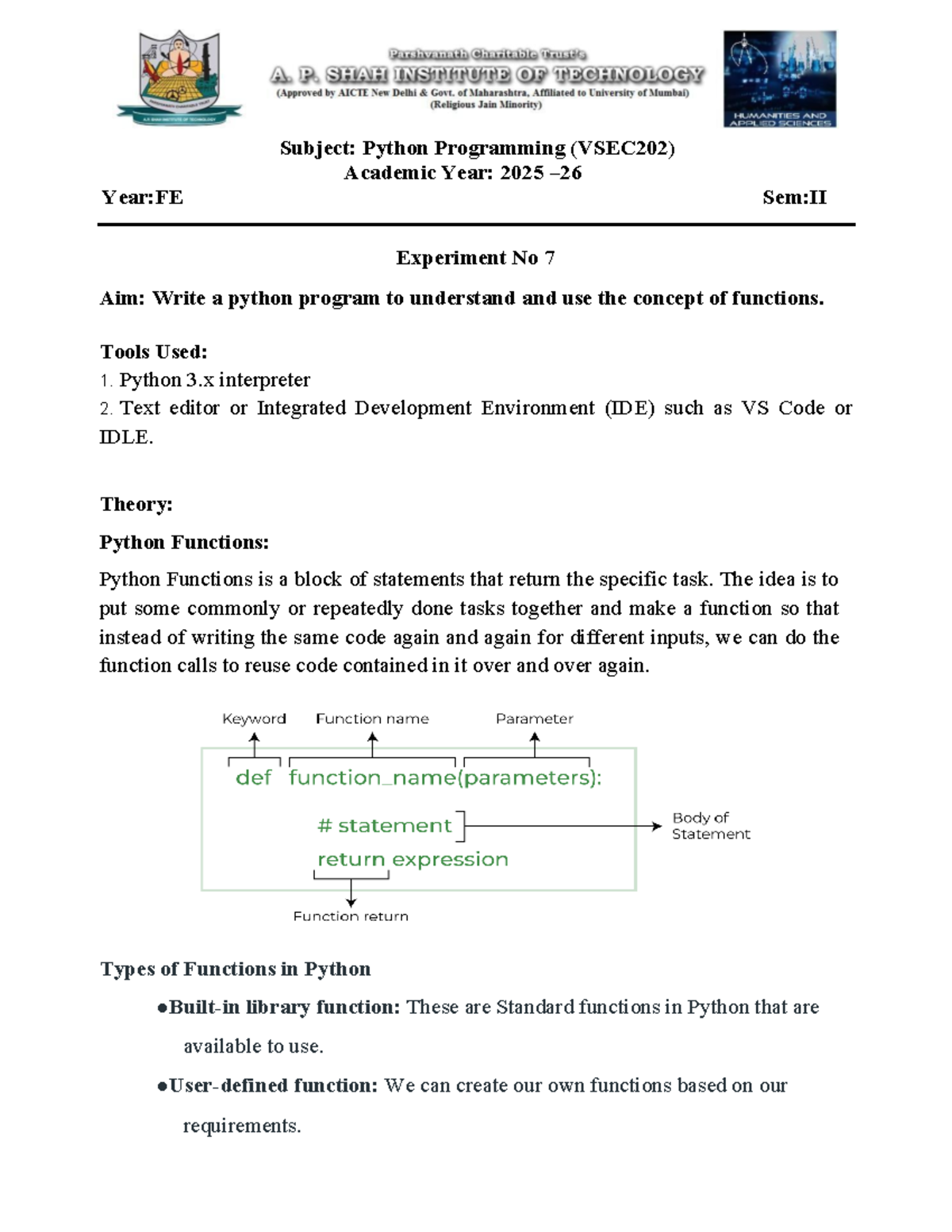 Python Programming (VSEC202) FE Sem II: Functions Experiment No 7 - Studocu