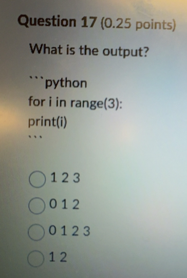Solved: What is the output? `、 python for i in range(3): print(i) 、、、 1 ...