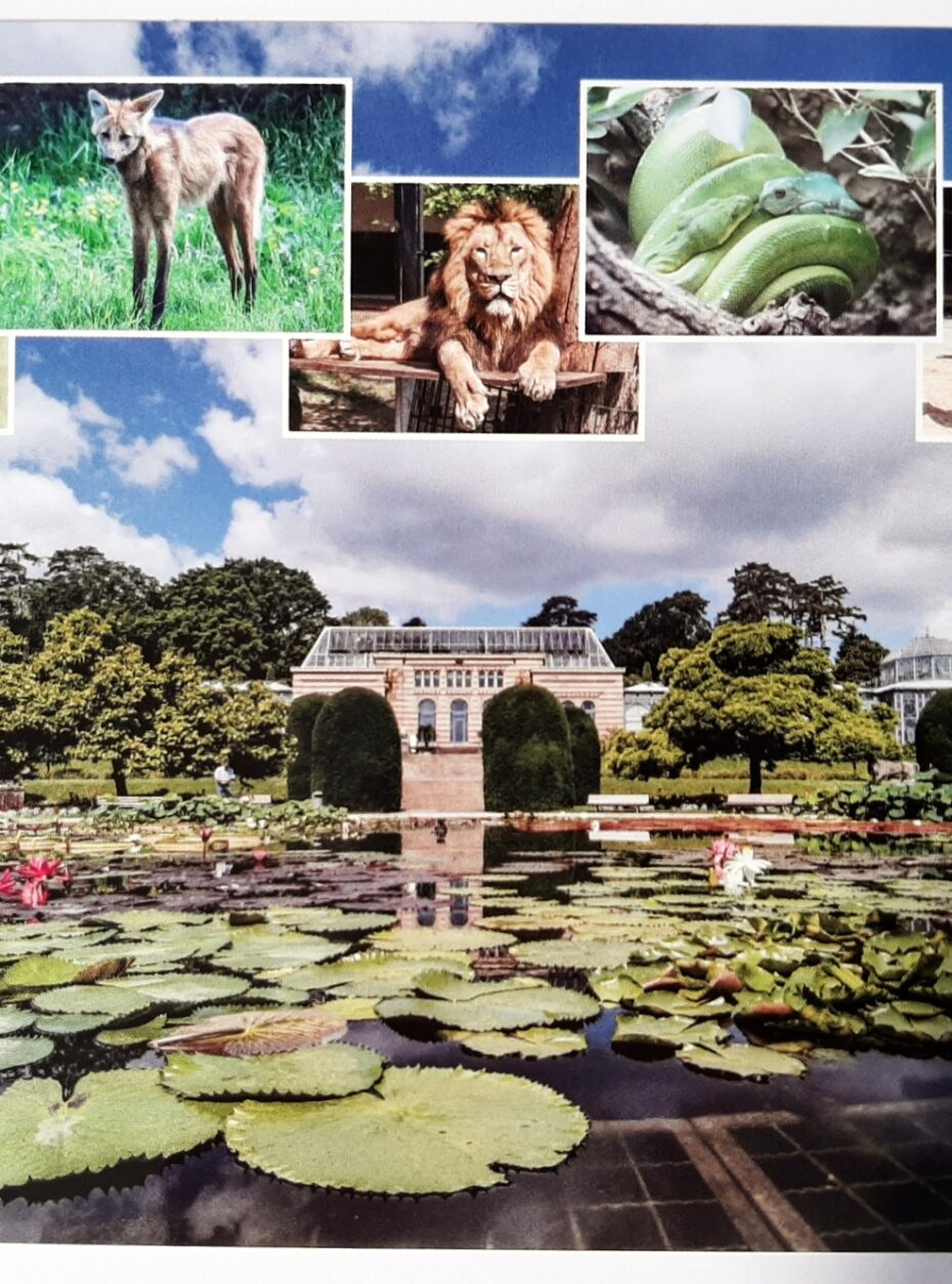 Postkarte Seerosenteich, Ziege, Mähnenwolf, Löwe, Python, Elefant ...