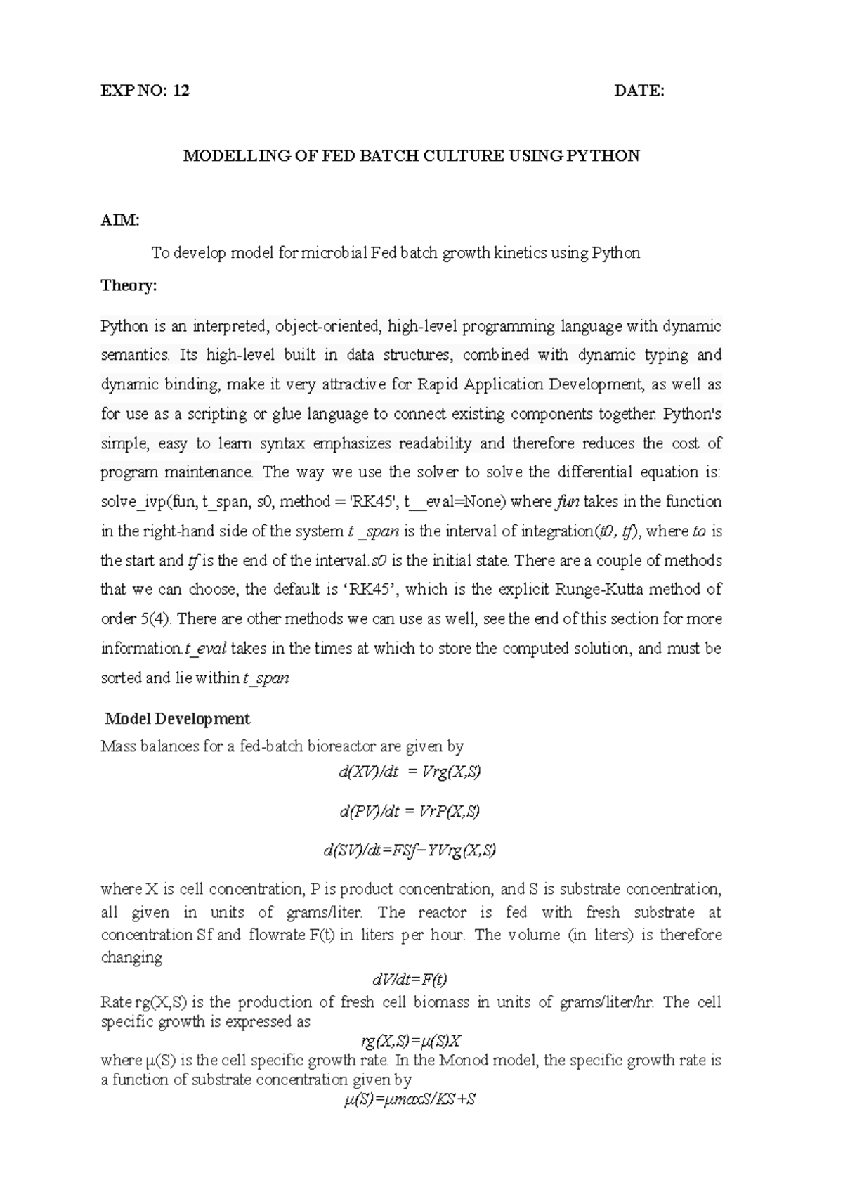 Fed Batch culture Python - EXP NO: 12 DATE: MODELLING OF FED BATCH ...