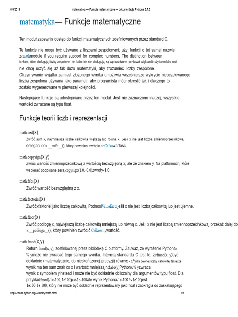 Dokumentacja Python 3.7.3 - Funkcje Matematyczne | PDF