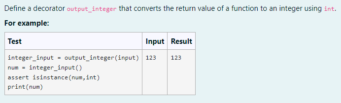 Solved Python code. Define a decorator output_integer | Chegg.com