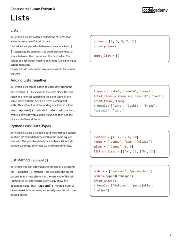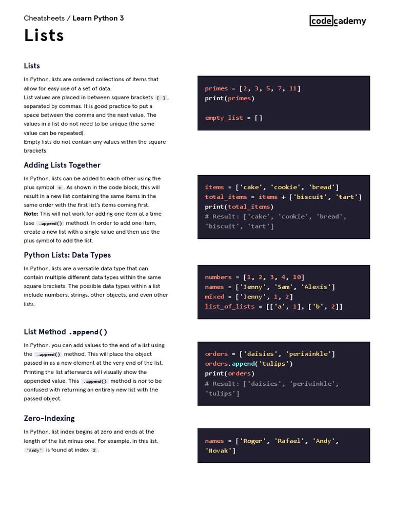 Learn Python 3 - Lists Cheatsheet - Codecademy | PDF