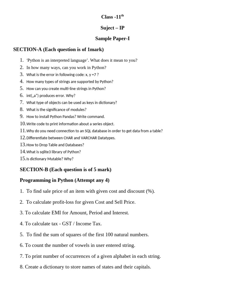 Class 11 IP Sample Paper - Python | PDF | Python (Programming Language ...