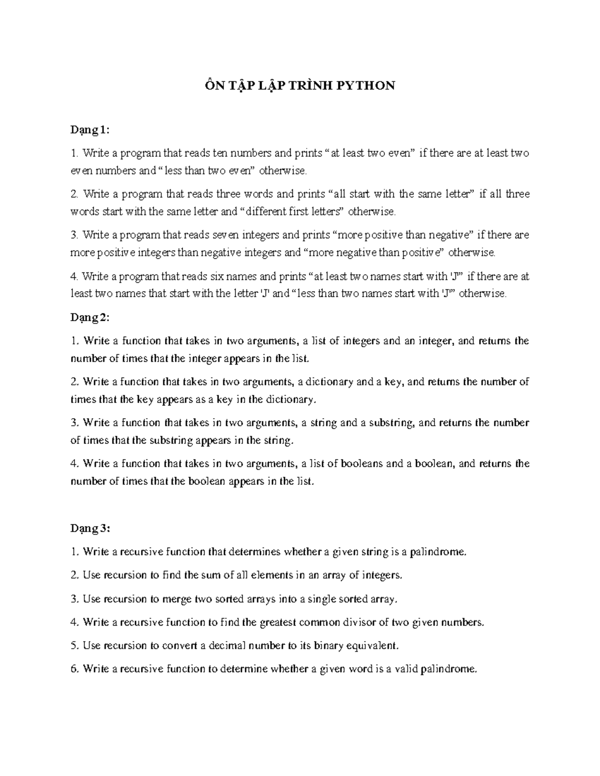 Ôn-tập python - VNUIS - ÔN TẬP LẬP TRÌNH PYTHON Dạng 1: Write a program ...