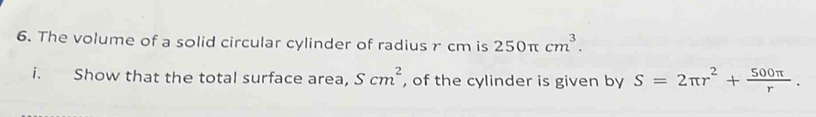 Solved: The volume of a solid circular cylinder of radius r cm is 250π ...