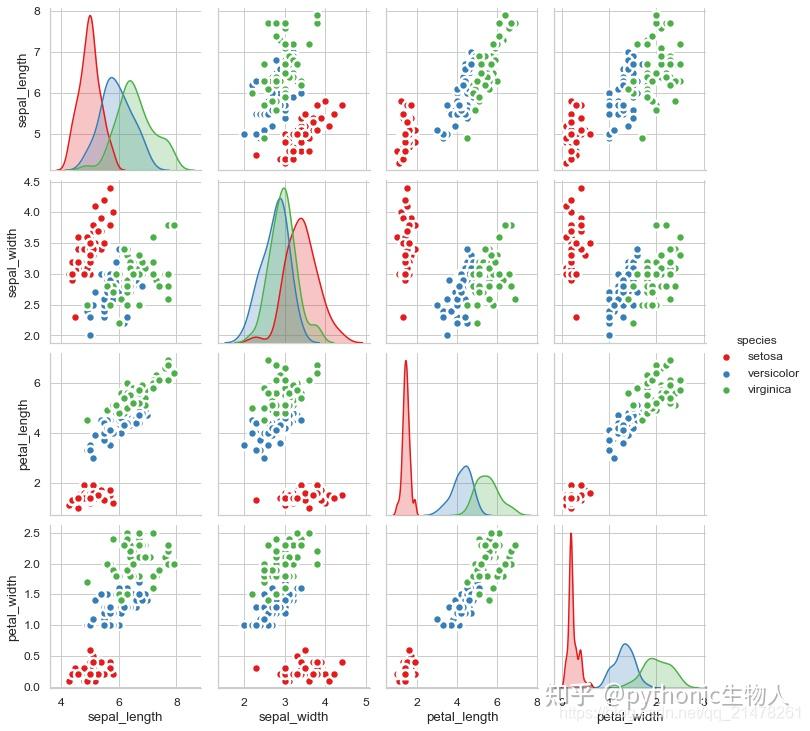 Pairs plot (pairwise plot) in seaborn with the pairplot function ...