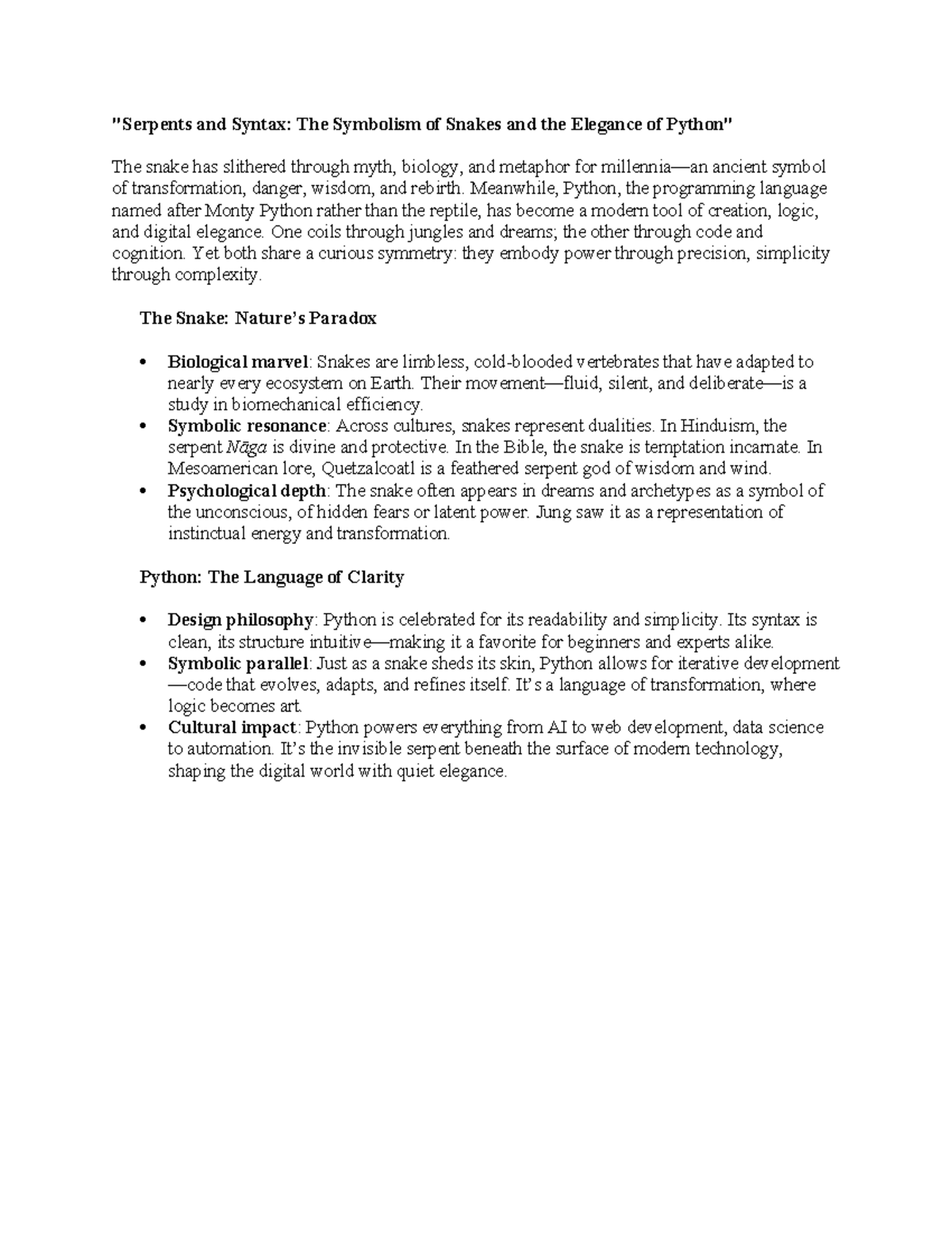 Serpents and Syntax: The Symbolism of Snakes and Python - Studocu