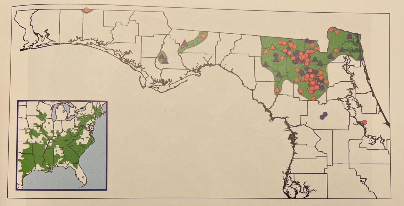Map of southeastern United States showing locations where pythons (A ...