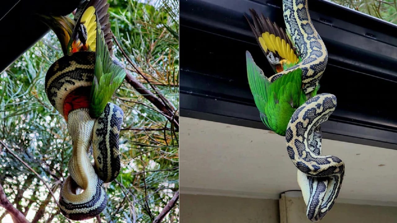 Viral: টিয়া পাখিকে পেঁচিয়ে উল্টো করে ঝুলছে ভয়ঙ্কর পাইথন, তারপর ...