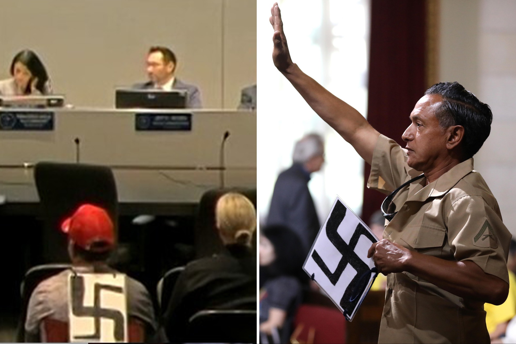 Swastika-wearing agitator makes profane gestures at LAPD officials