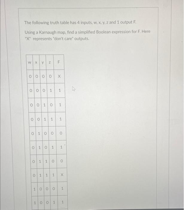 Solved The following truth table has 4 inputs, w, x,y,z and | Chegg.com