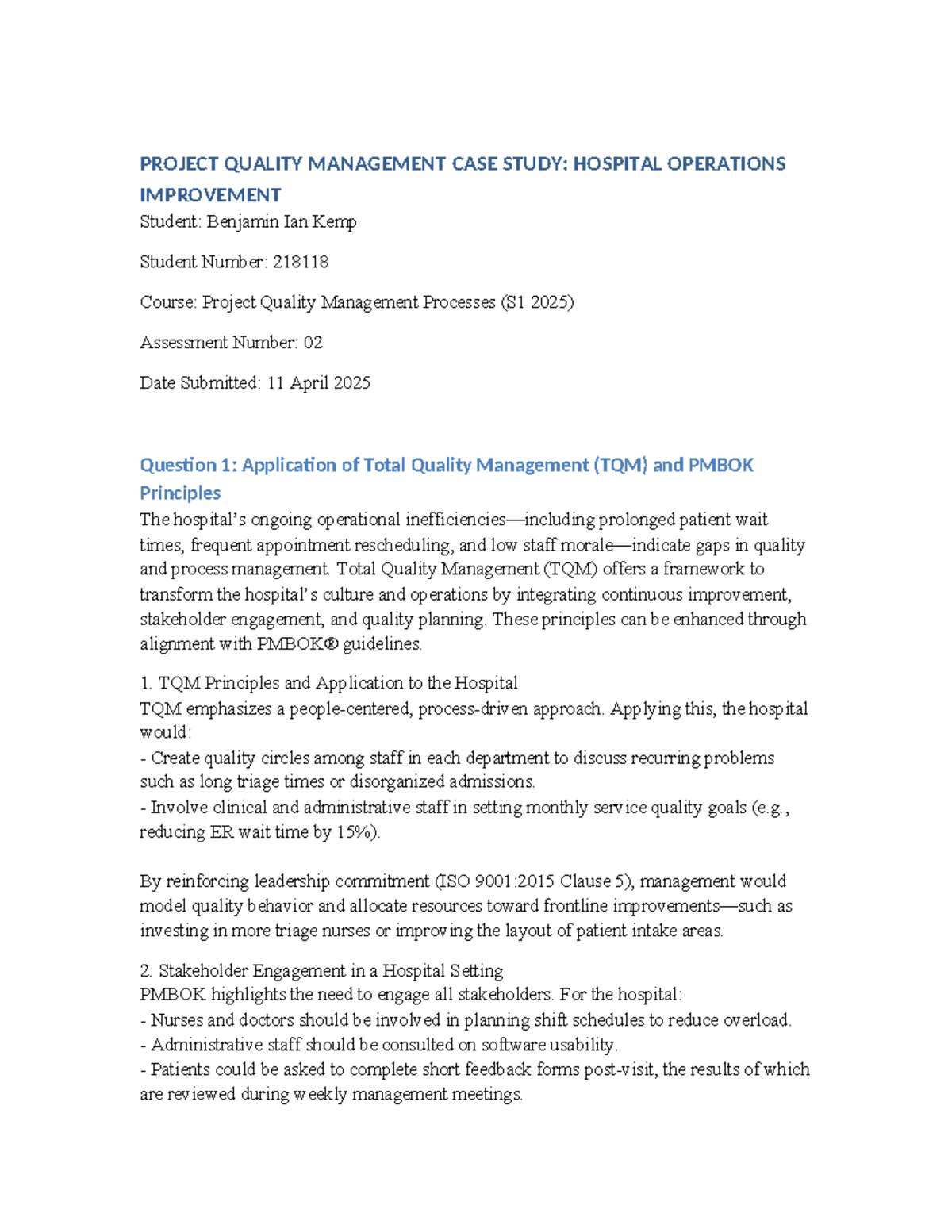 Project Quality Management Case Study: Hospital Operations (S1 2025 ...