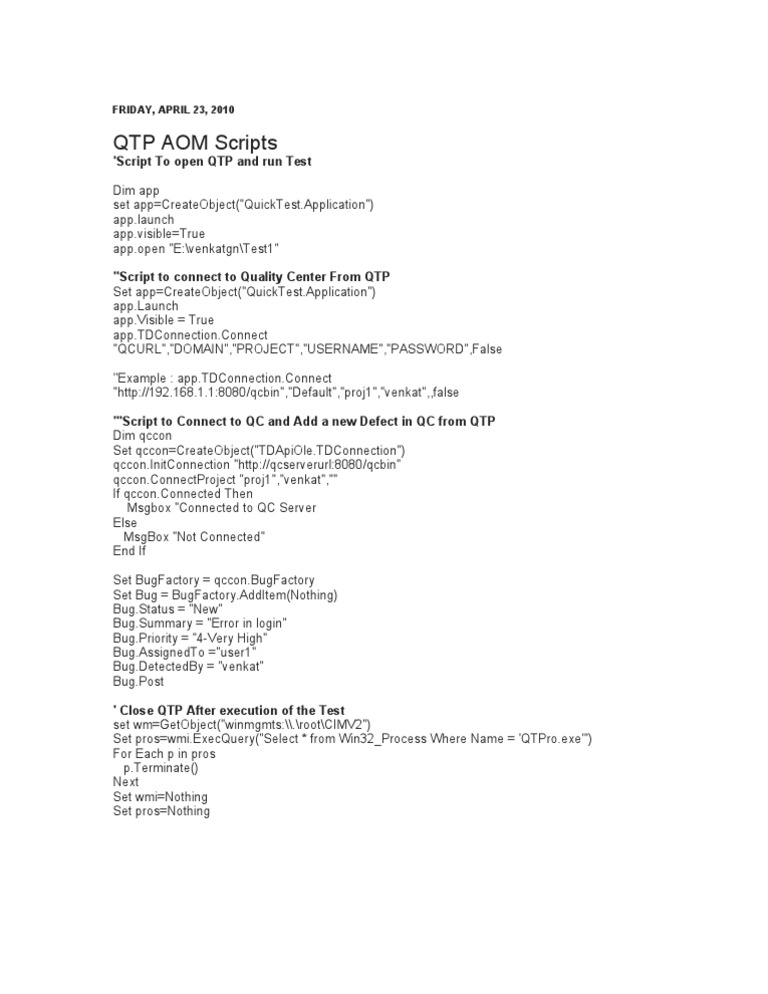 QTP AOM Scripts: 'Script To Open QTP and Run Test | PDF