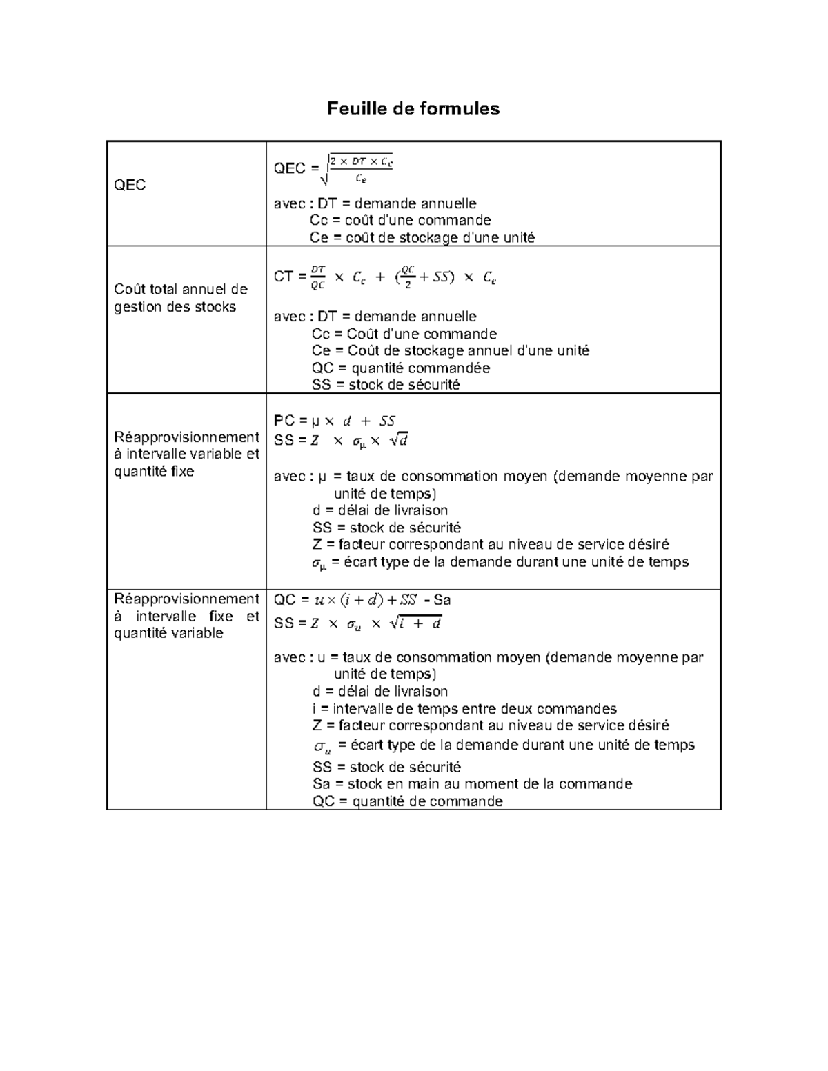 Feuille de Formules - Notes de Cours QEC - Studocu