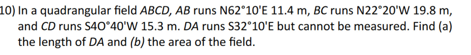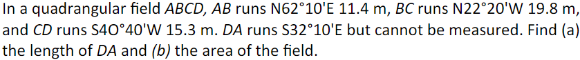 Solved In a quadrangular field ABCD,AB runs N62 10′E11.4 | Chegg.com