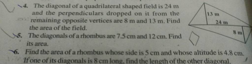 4. The diagonal of a quadrilateral shaped field is 24 mS and the perpendi..