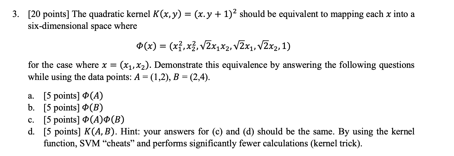 Solved [20 points] The quadratic kernel K(x,y)=(x.y+1)2 | Chegg.com