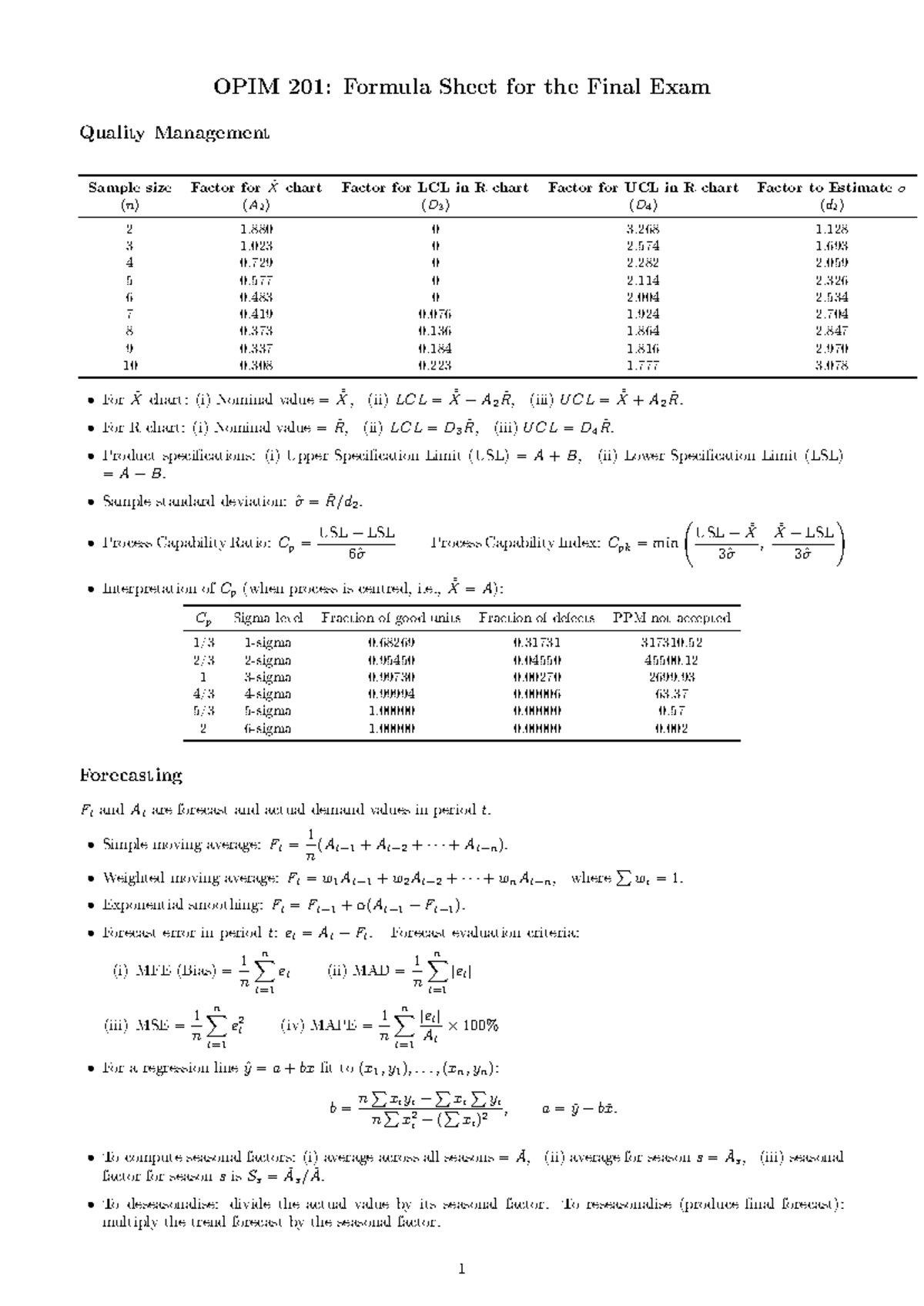 OPIM 201: Final Exam Formula Sheet for Quality Management - Studocu