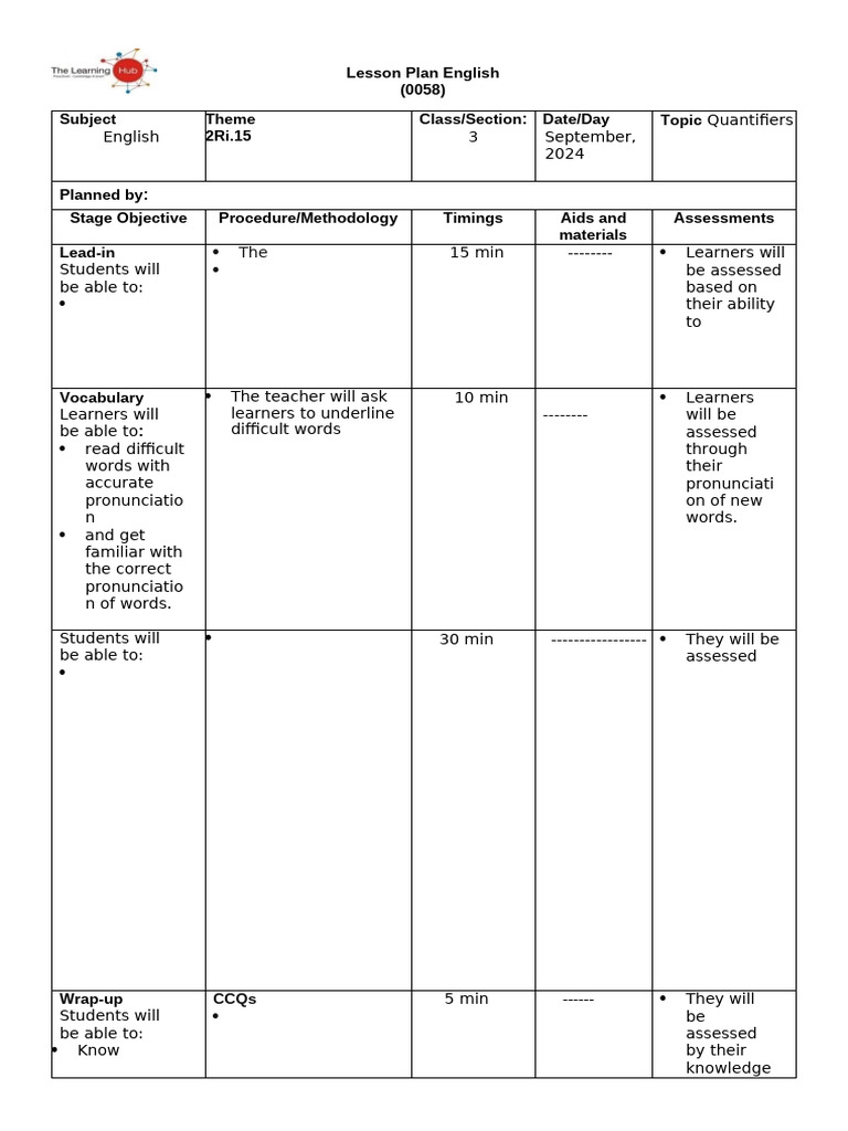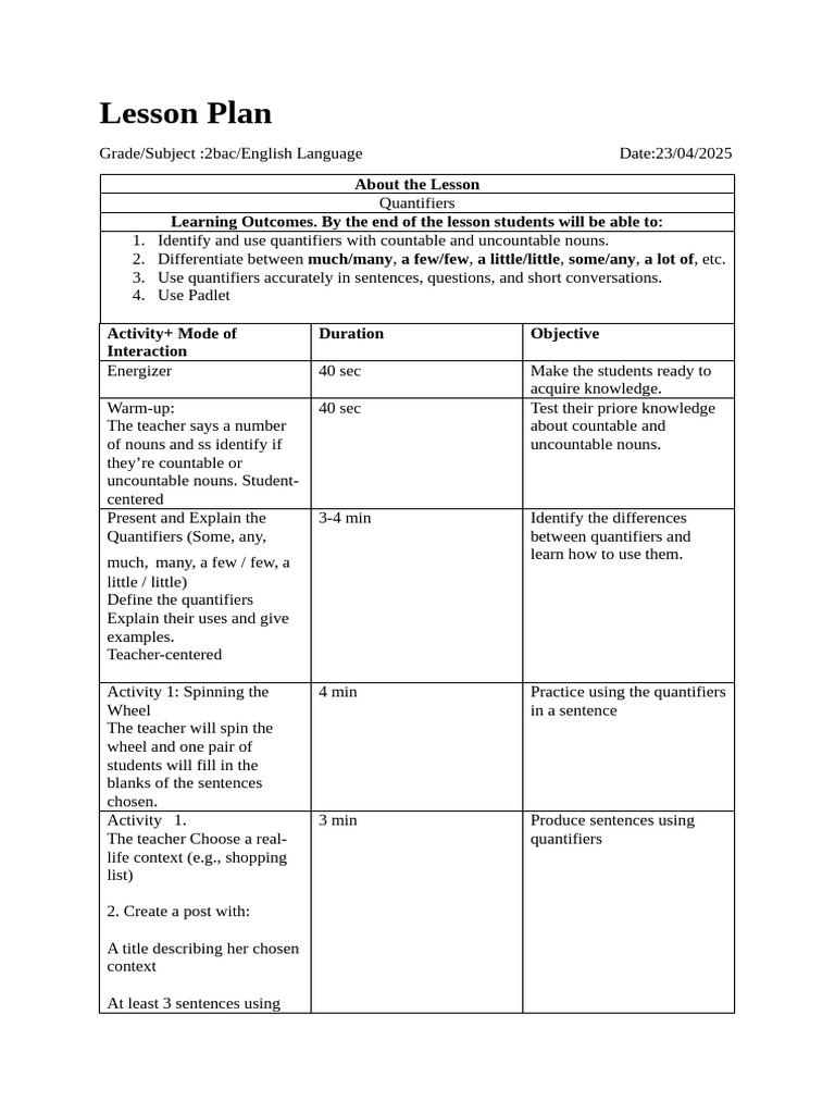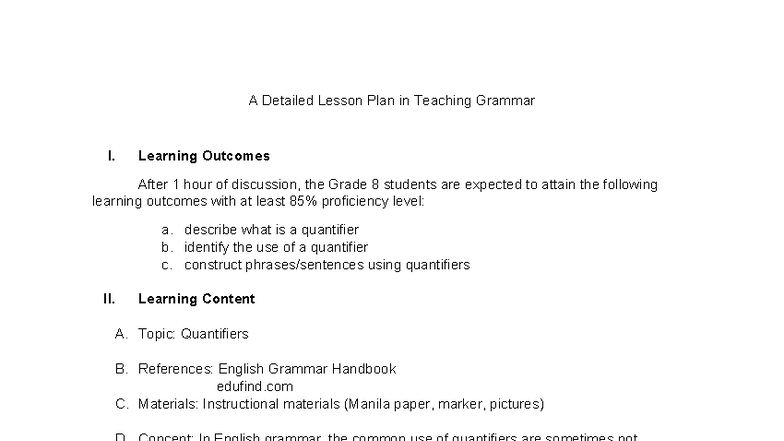 Detailed Lesson Plan on Quantifiers for Grammar I (414973337) - Studocu