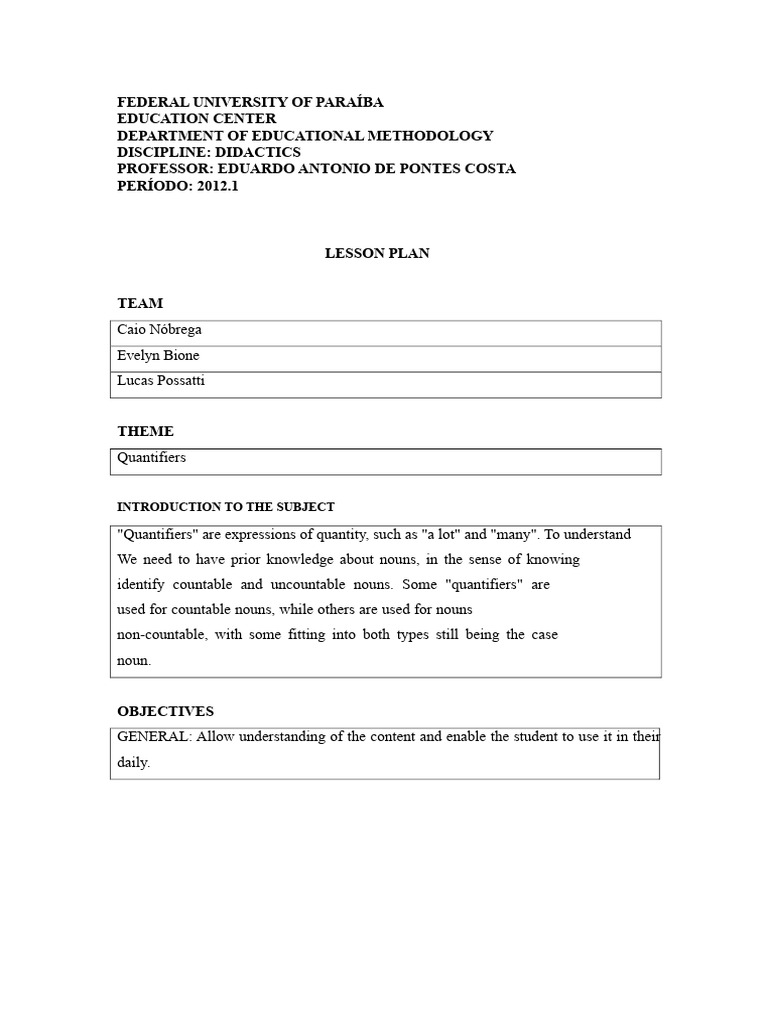 Lesson Plan On Quantifiers | PDF | Teachers | Lesson Plan