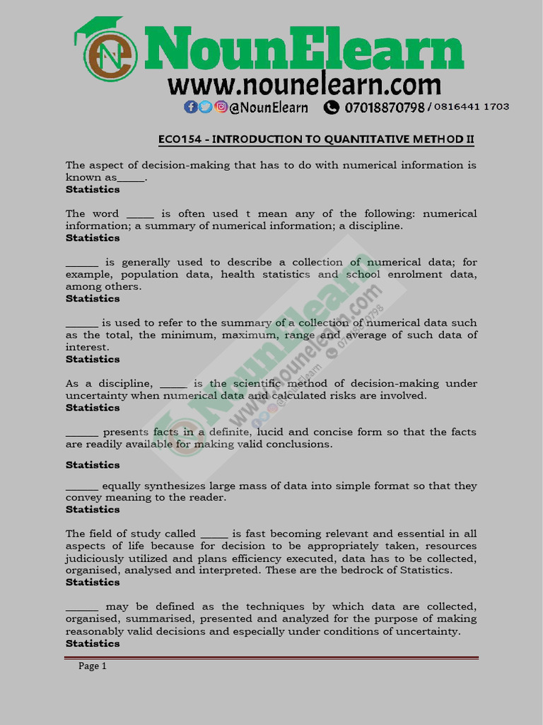 Eco154 Introduction To Quantitative Method II Summary | PDF | Mean ...