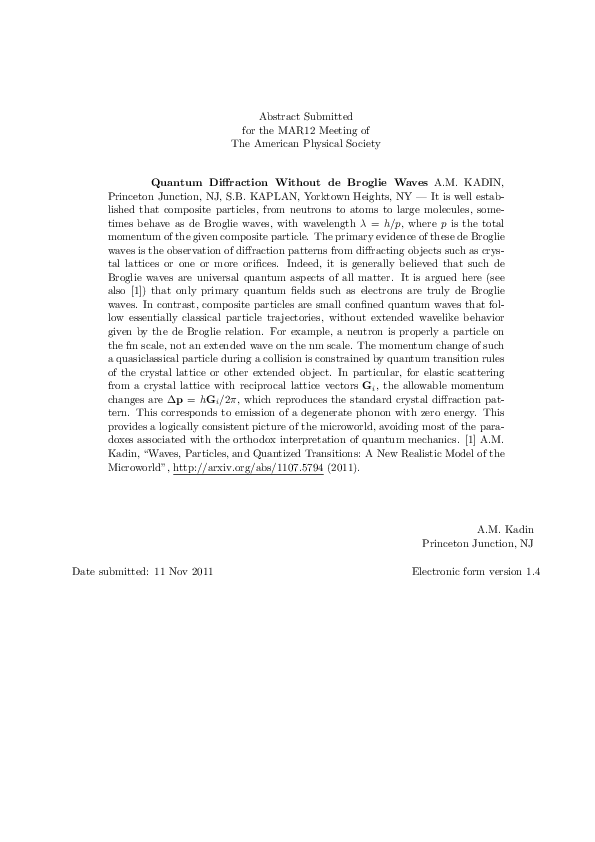 (PDF) Quantum Diffraction Without de Broglie Waves | A. Kadin ...