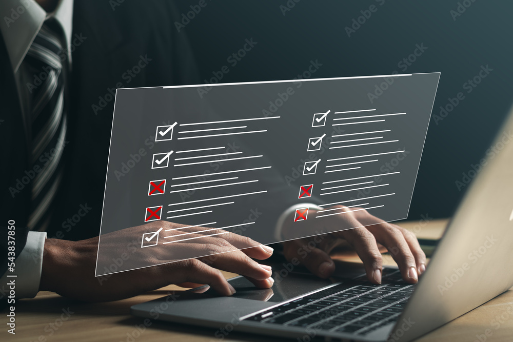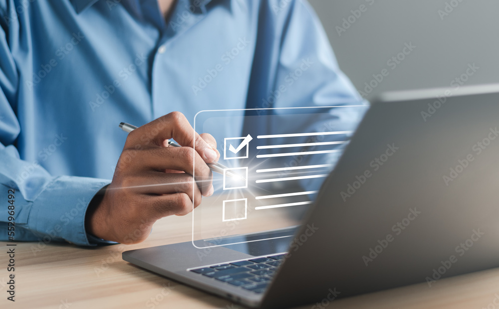 Questionnaire with checkboxes businessman use laptop with filling ...