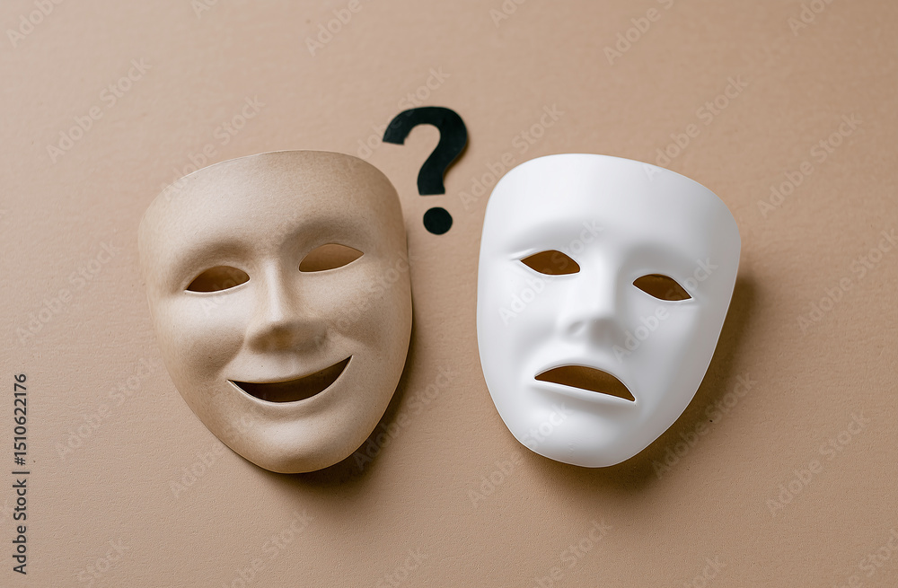 Flat lay of two human masks beside a question mark on neutral desk ...