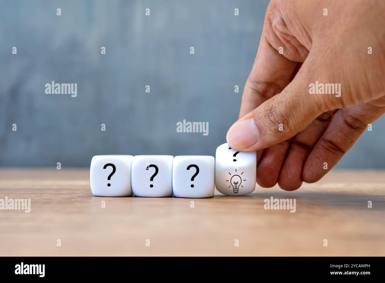Question marks and lightbulb on white cubes. Problem solving ...