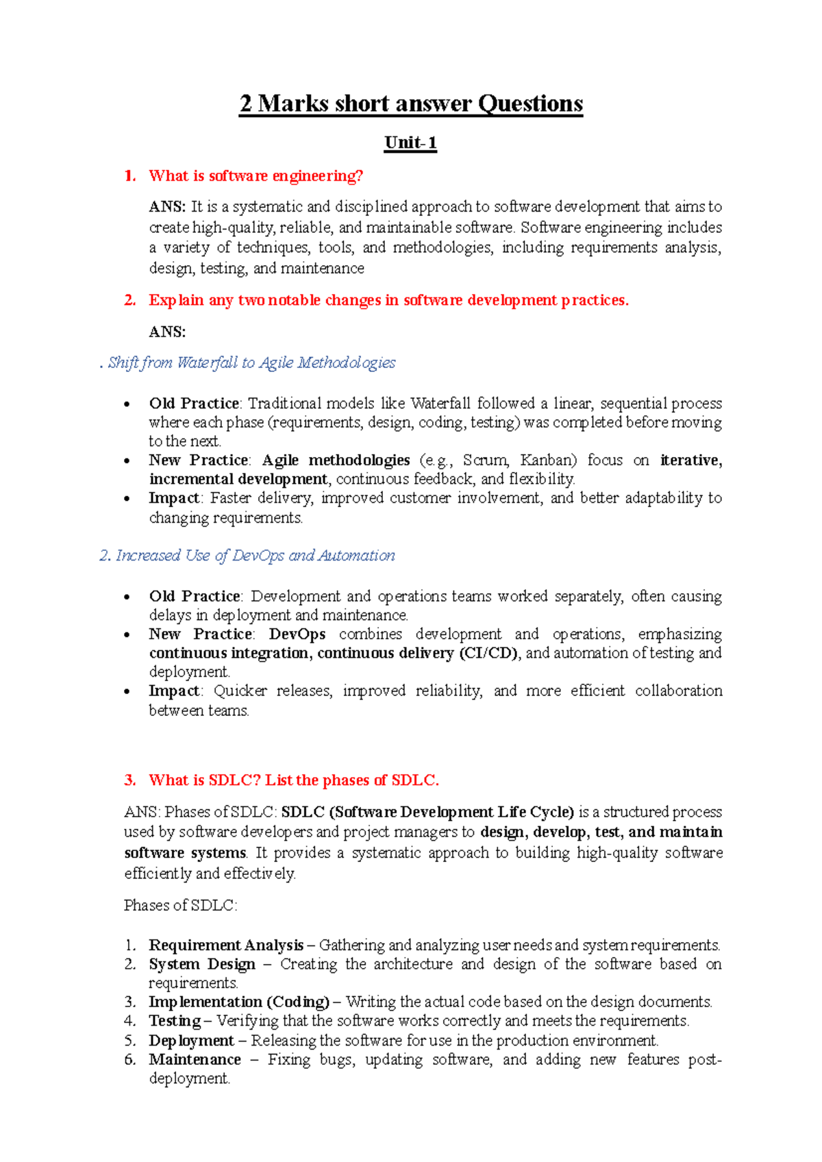 SE 2 Marks Important Questions: Software Engineering Overview - Studocu