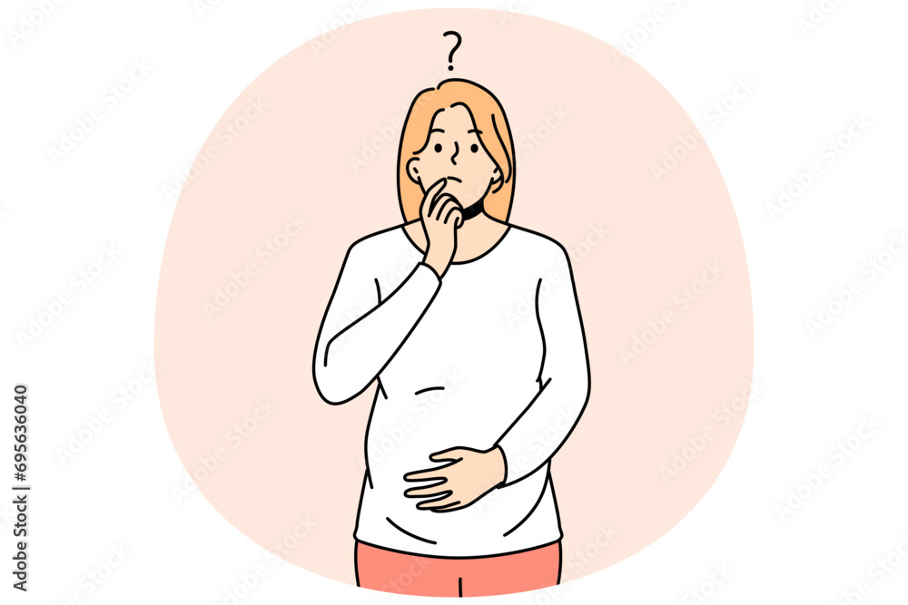 Frustrated young pregnant woman touch belly feeling doubtful thinking ...