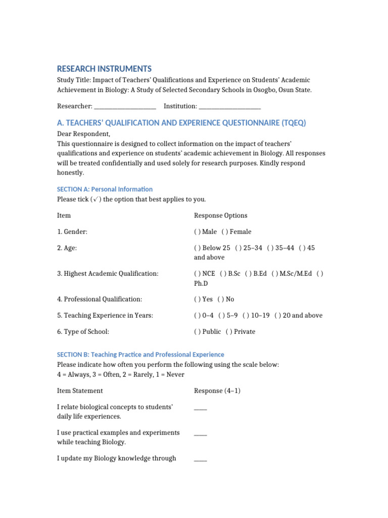Teachers and Students Questionnaires Table Format | PDF | Teachers ...