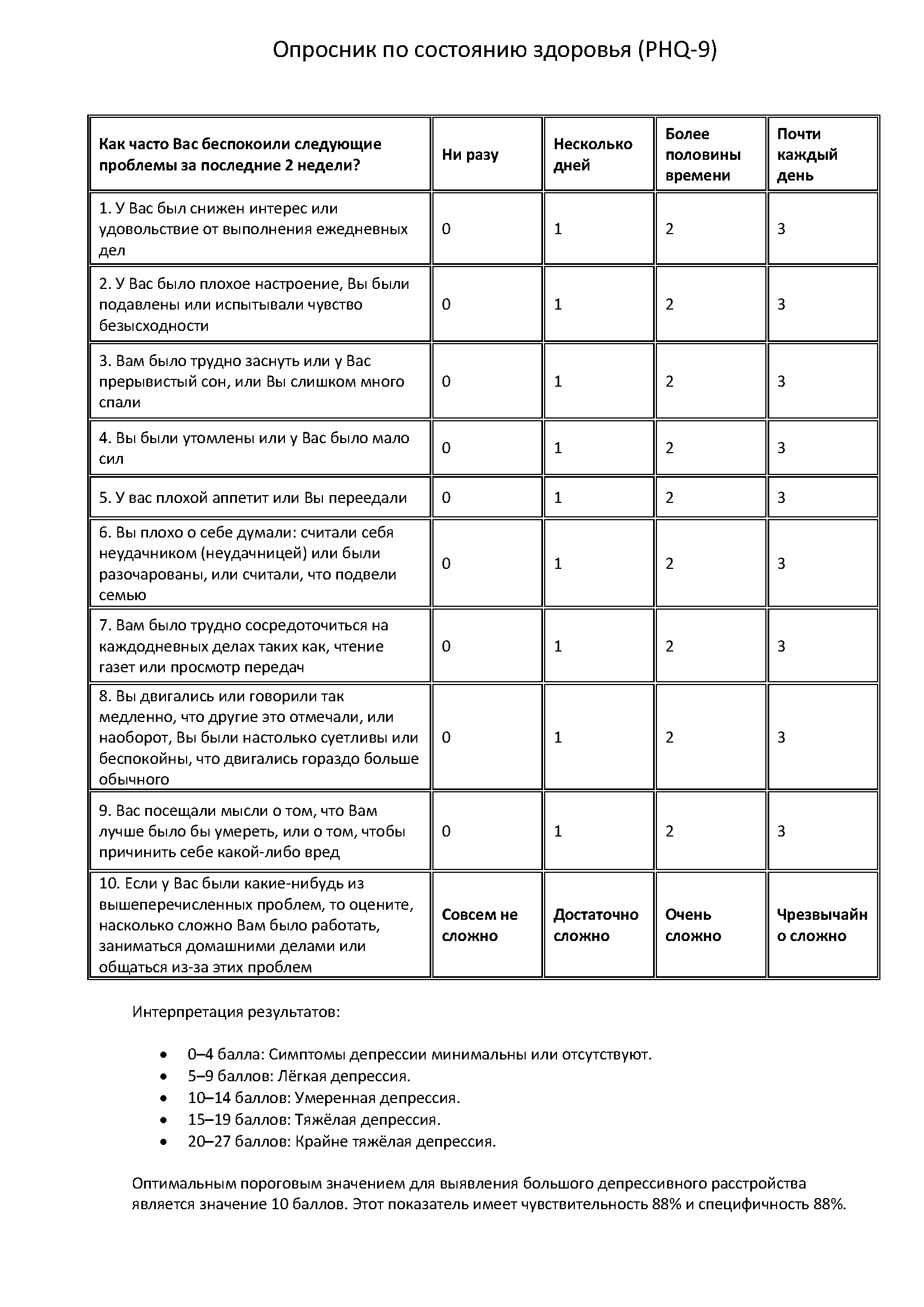Interpretation of the patient health questionnaire (PHQ-9) [Screening ...