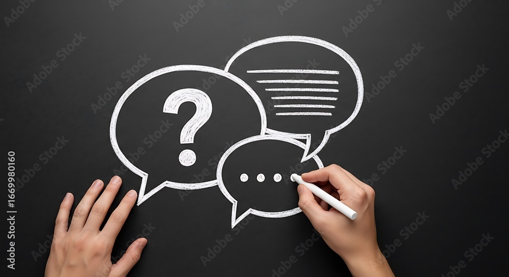 Chalkboard drawing of overlapping speech bubbles, showcasing questions ...