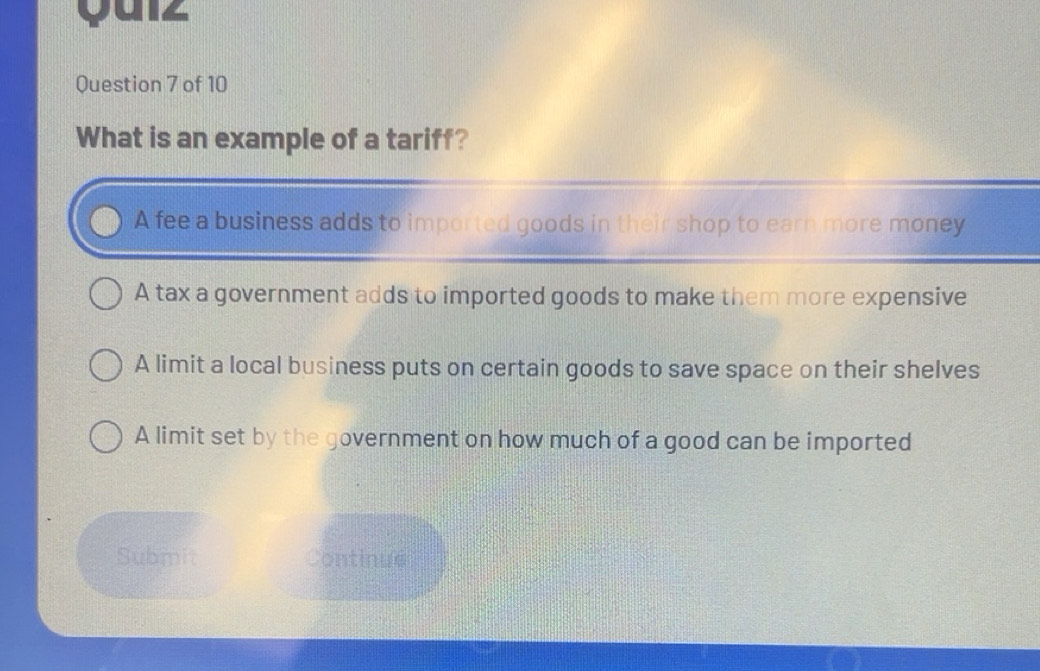 Solved: Quiz Question 7 of 10 What is an example of a tariff? A fee a ...