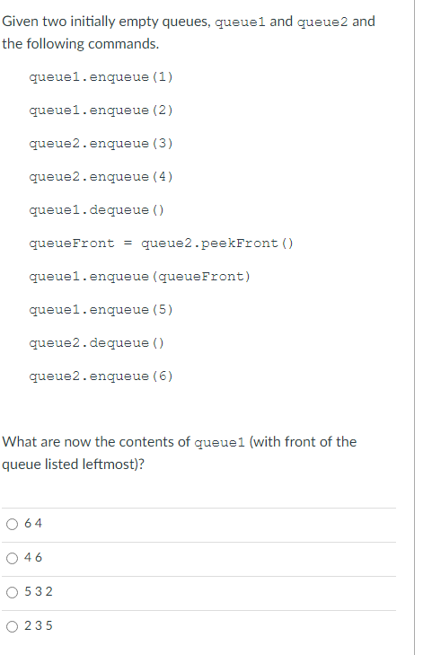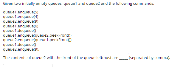 Solved Given two initially empty queues, queuel and queue2 | Chegg.com
