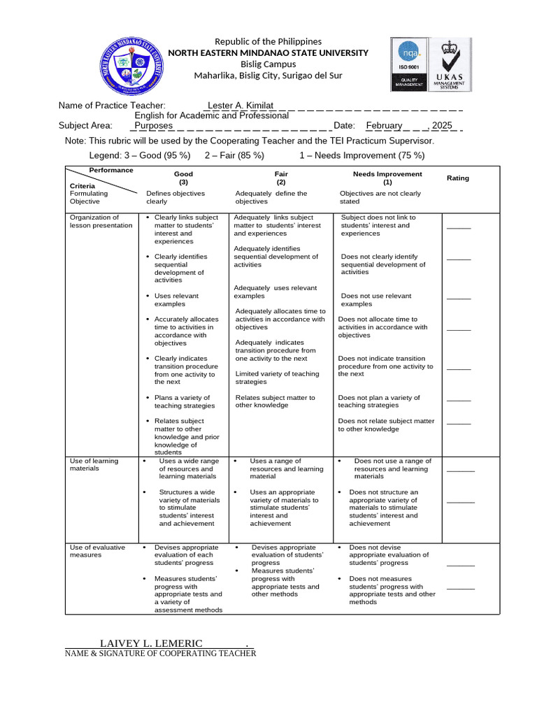 Rating Scale Evaluation Form For FS Students Revised 2 | Download Free ...