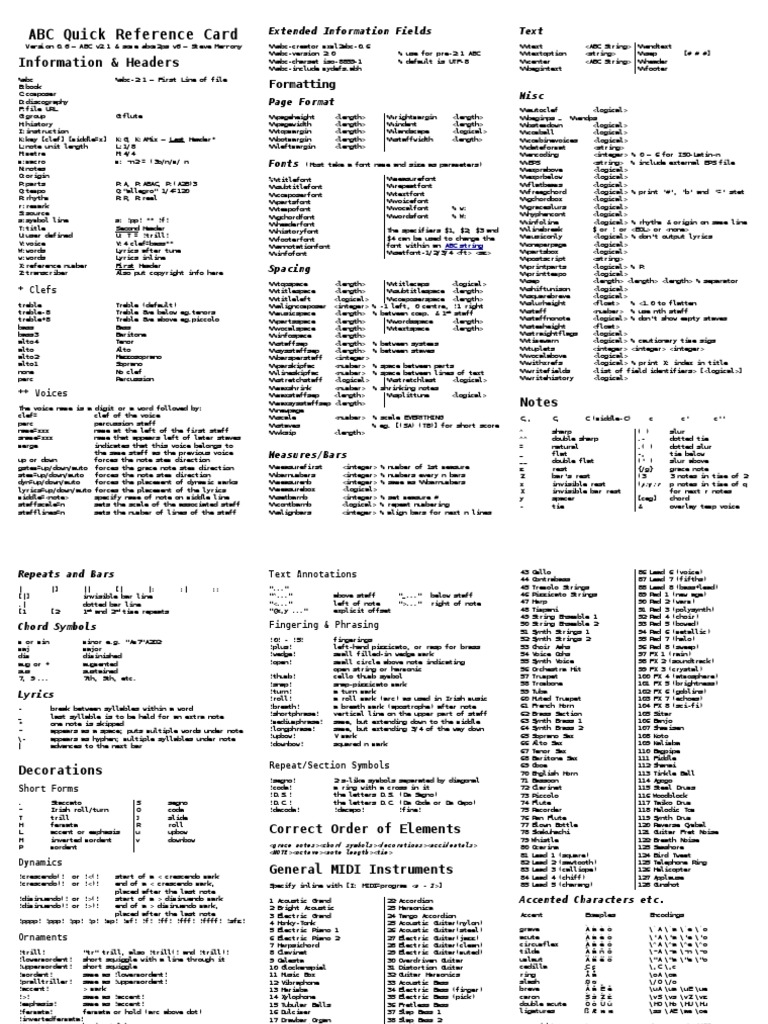 ABC Quick Reference Card: Information & Headers | PDF | Clef | Music ...