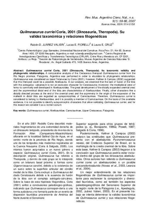 (PDF) Quilmesaurus curriei Coria, 2001 (Dinosauria, Theropoda). Its ...