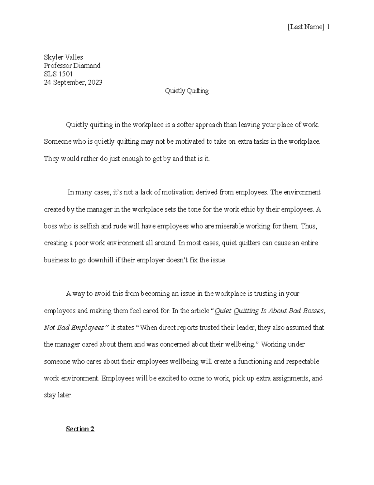 Quiet quitters assignment - [Last Name] 1 Skyler Valles Professor ...