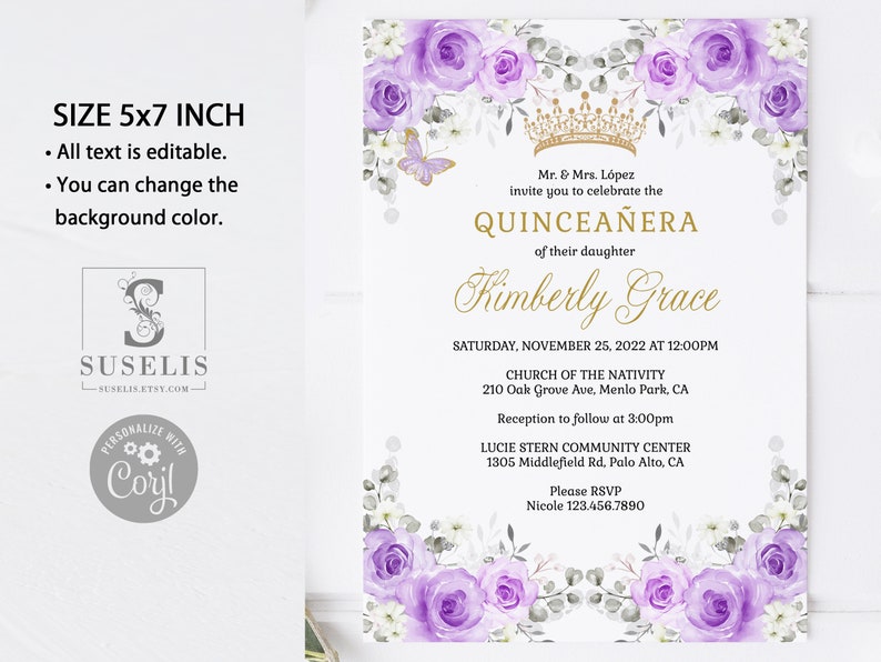 EDITABLE Quinceanera Invitation Template, Lavender Flowers, Butterfly ...