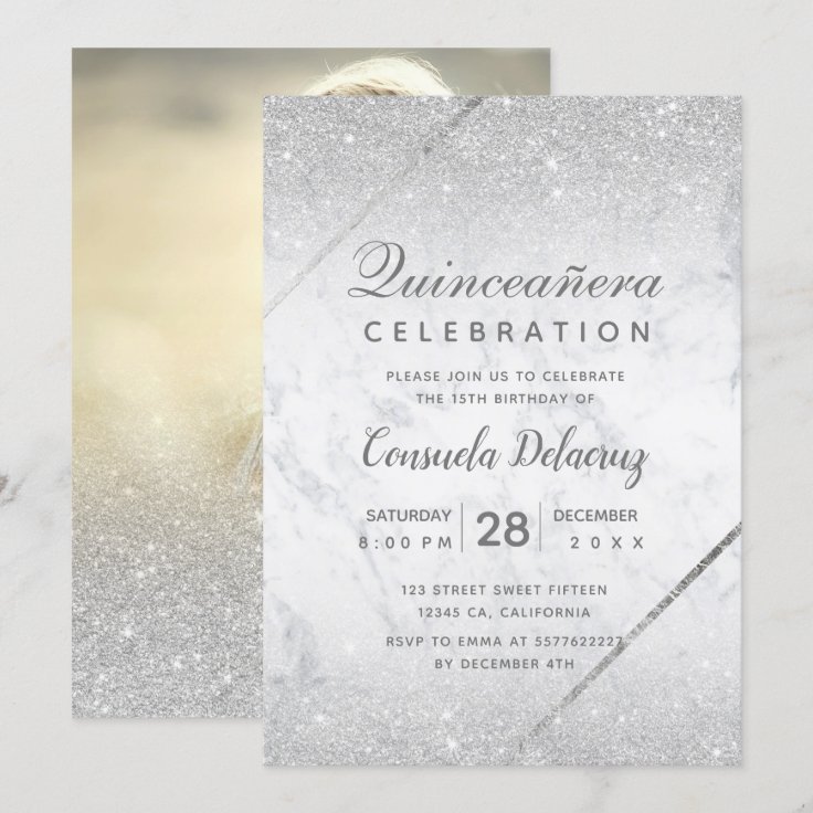 Chic silver glitter script marble Quinceanera Invitation | Zazzle