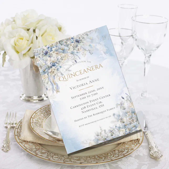 Dusty Blue Floral Watercolor Script Quinceañera Invitation | Zazzle
